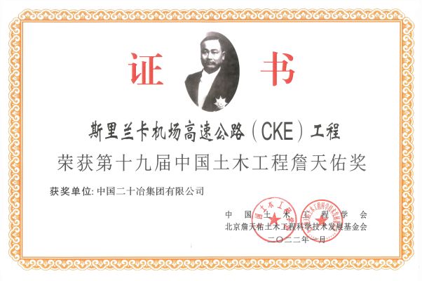 中國土木工程詹天佑獎是中國土木工程領域工程建設項目科技創新的最高榮譽獎,第十九屆中國土木工程詹天佑獎經過推薦申報、資格審查、專業組初評、終審會議評審、詹天佑大獎指導委員會審核以及公示等評選程序,最終有斯里蘭卡機場高速公路(CKE)工程等42項土木工程領域的杰出代表性工程獲獎。